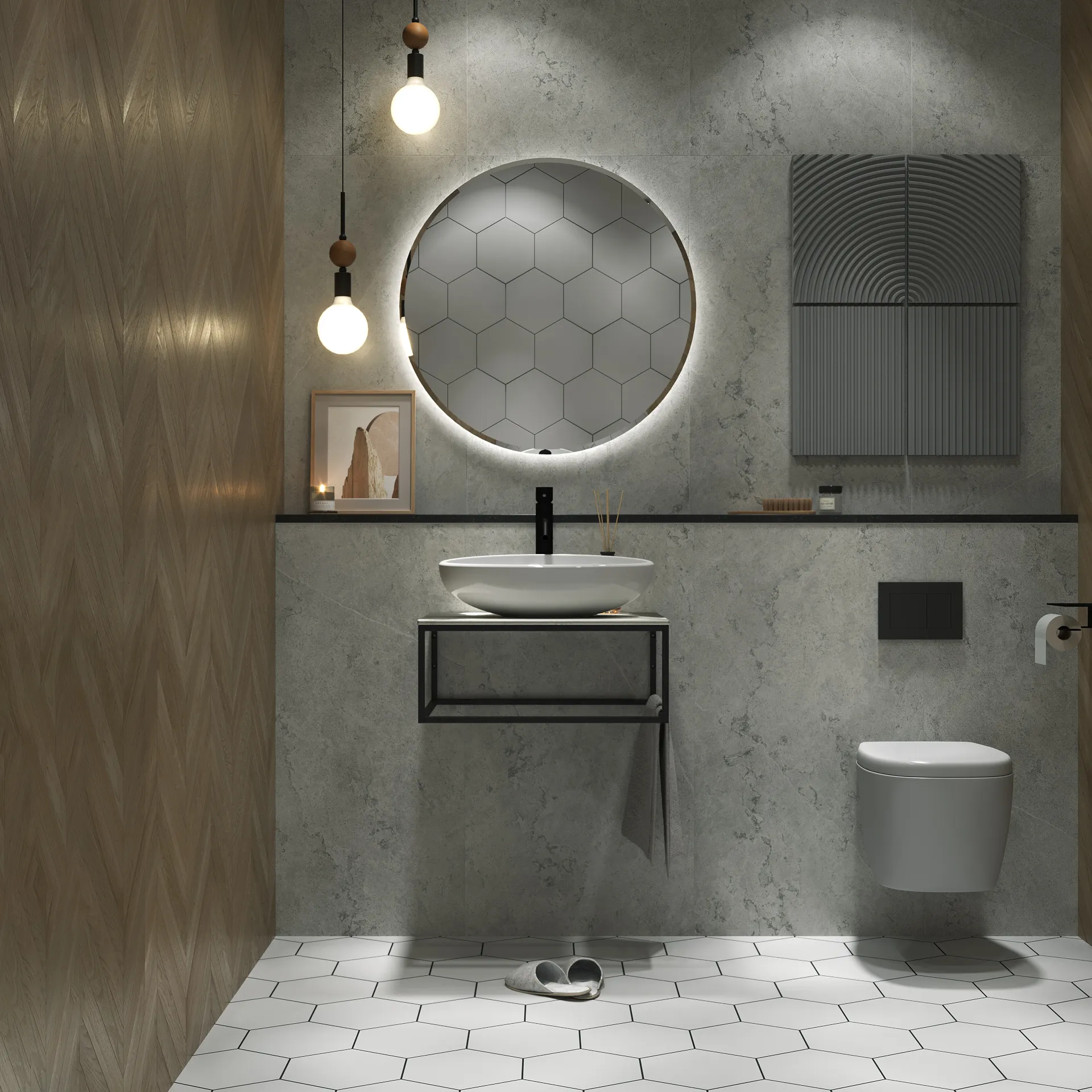 Столешница из керамогранита - это стильное, функциональное и долговечное решение, которое подойдет для ванных комнат, исполненных в самых разнообразных отделочных материалах. Такая универсальность, тем не менее, предполагает высокую декоративную и эстетическую ценность столешницы - она делает обстановку в ванной комнате по-настоящему стильной и соответствующей актуальным тенденциям в дизайне. Металлическое подстолье создает эффектный цветовой контраст, а также может использоваться в качестве практичных рейлингов для удобного размещения полотенец и банных халатов.