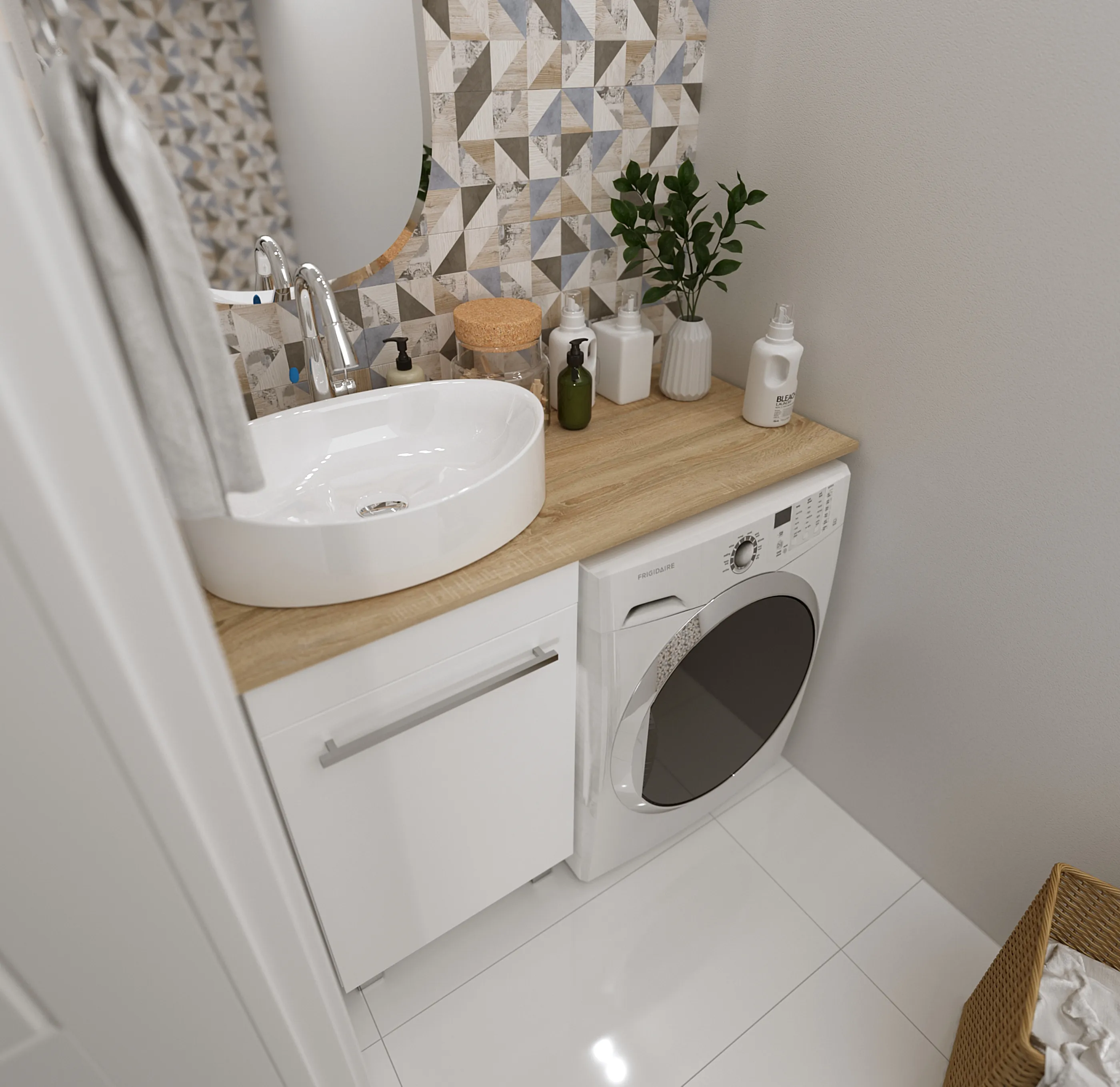 Столешница под стиральную машину, которая позволяет с максимальным комфортом и удобством организовать пространство даже в небольшой ванной комнате. Исполненная в универсальной и одновременно стильной прямоугольной форме, она включает в себя место под раковину и функциональную зону для размещения косметики, личных принадлежностей и аксессуаров. Материалом исполнения столешницы является МДФ, а ее дополнительная защита от воздействия влаги и внешних повреждений обеспечивается покрытием корпуса пленкой ПВХ.Характеристики: