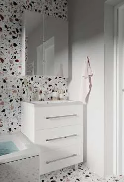 Стильная и лаконичная тумба для ванной комнаты, в дизайне которой нет ничего лишнего - только минимализм и акцент на безоговорочную функциональность. Отсутствие ручек и строгие геометрические формы делают ее актуальной для интерьеров в абсолютно любой современной или эклектичной стилистике. Благодаря качественной фурнитуре ежедневное использование тумбы отличается максимальным удобством. Практичное разделение ящиков на небольшие отсеки позволяет с комфортом организовать хранение косметики и других вещей. Глянцевая белая поверхность гармонично дополнит пространства в любой цветовой гамме.