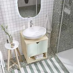 Практичная тумба с многофункциональной конструкцией. Практичная ручка закрывающегося шкафчика может использоваться как держатель для небольших полотенец. Лаконичная конструкция и минималистичный дизайн без лишних деталей делают эту тумбу подходящей для интерьера ванной комнаты в любой стилистике. Она будет одинаково уместна как в классических сдержанных пространствах, так и в современных или даже эклектичных комнатах, оформленных на стыке разных стилей.